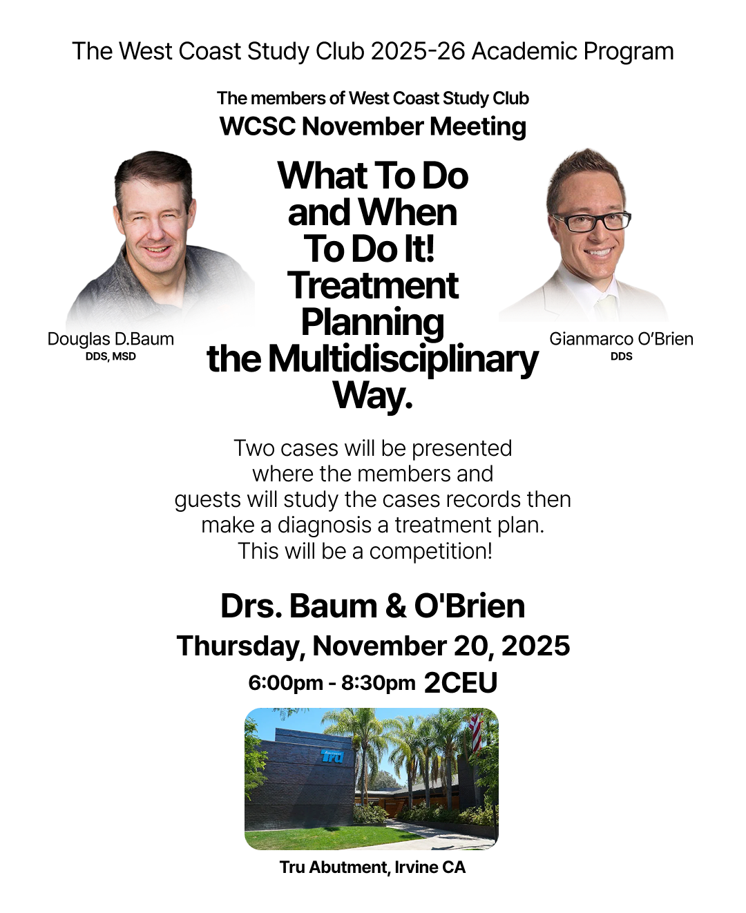 We bring together 11 exciting programs over 10 months. We will focus on clinical periodontics as the foundation for the complex, and interdisciplinary dentistry that we carry out on a daily basis. To that end, we have invited some of the most talented periodontists in southern California over 4 evening programs. We are so happy to announce that Dr. Gerard Chiche will be overseeing a hands-on workshop program on esthetic dentistry in December. In June we will, as a group, celebrate in the annual symposium where we hope to see our members blossom and present cases and techniques that we work hard to develop and perfect.